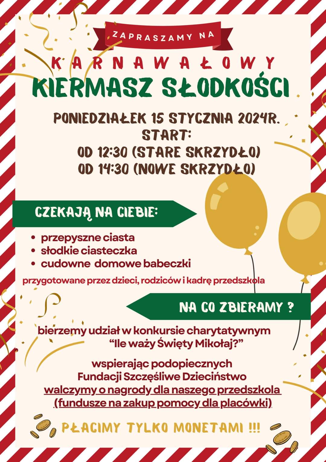Zapraszamy na KARNAWAŁOWY KIERMASZ SŁODKOŚCI 15.01.2024