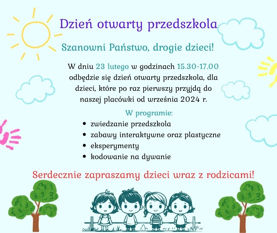 Zapraszamy na „Dzień otwarty przedszkola” 23.02.24r.