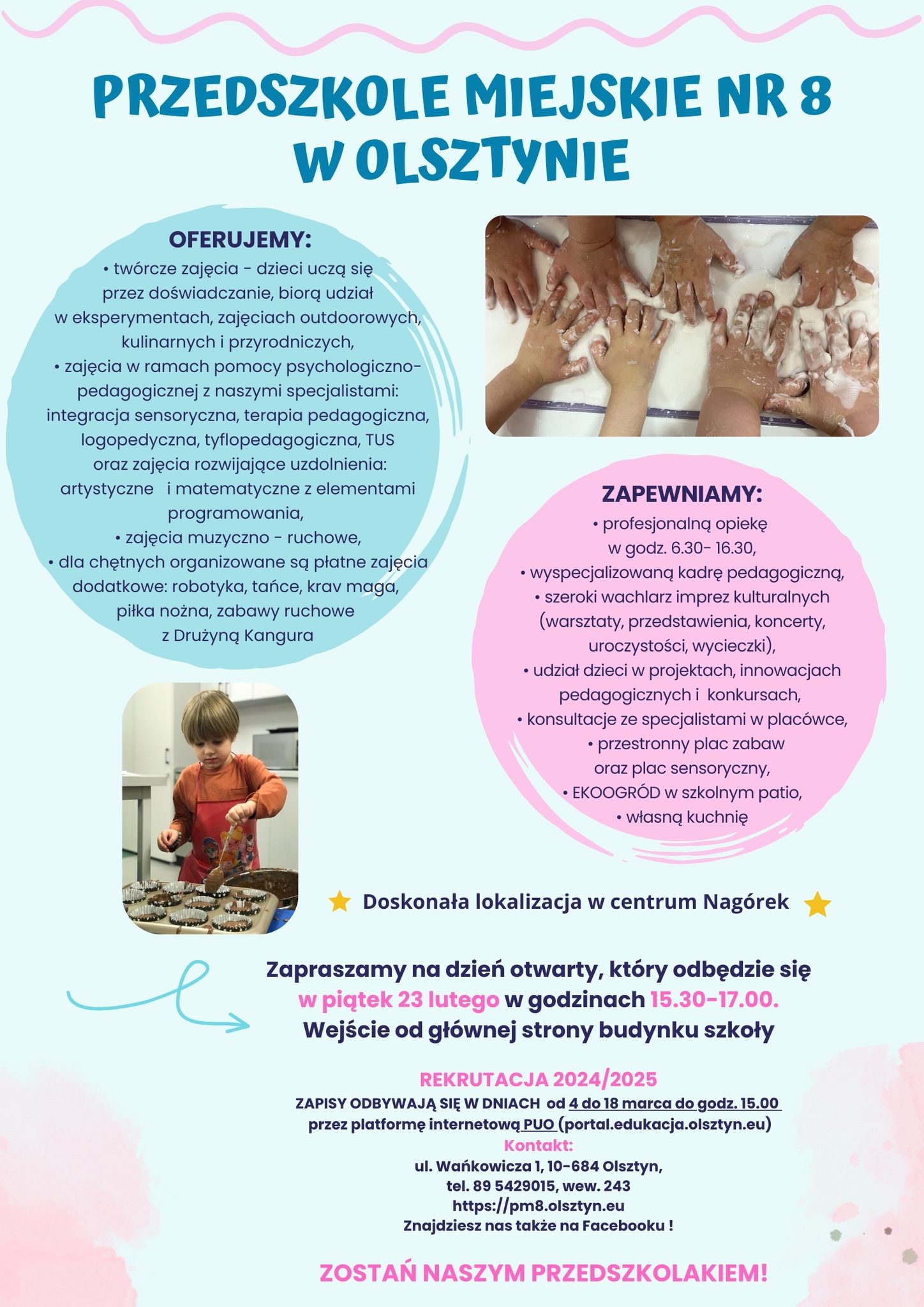 Szanowni Rodzice Informujemy, że rekrutacja do Przedszkola Miejskiego Nr 8 w Olsztynie na rok szkolny 2026/2027 trwa: od 23 lutego 2026 r. od godz. 8:00 do 20 marca 2026 r. do godz. 15:00. Wszystkie informacje niezbędne do naboru oraz aktualna oferta naszego przedszkola znajdują się w zakładce REKRUTACJA.