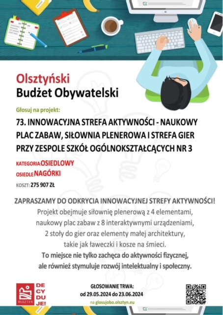 dzięki zaangażowaniu i wsparciu Rodziców z naszej placówki złożyliśmy w tym roku w ramach Olsztyńskiego Budżetu Obywatelskiego OBO 2025 projekt 73 „Innowacyjna Strefa Aktywności – Naukowy plac zabaw, siłownia plenerowa i strefa gier przy Zespole Szkół Ogólnokształcących nr 3”. Strefa usytuowana na terenach zielonych przy ZSO nr 3 będzie miała charakter otwarty i ogólnodostępny nie tylko dla naszych Przedszkolaków i Uczniów Zespołu, ale dla wszystkich mieszkańców Osiedla Nagórki i okolic.
